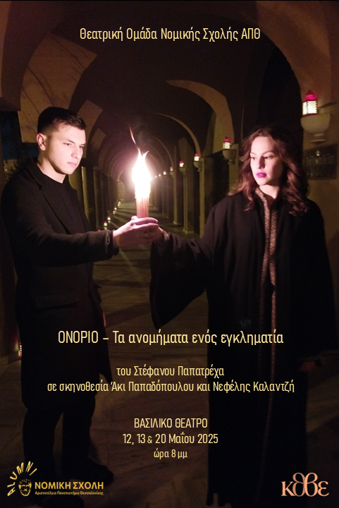 20 Μαΐου 2025: Θεατρικό έργο: “Ονόριο – τα ανομήματα ενός εγκληματία” «Ονόριο – τα ανομήματα ενός εγκληματία» του θεατρικού συγγραφέα Στέφανου Παπατρέχα, σε σκηνοθεσία Νεφέλης Καλατζή και Άκι Παπαδόπουλου Θεατρική Ομάδα Νομικής Σχολής ΑΠΘ.
