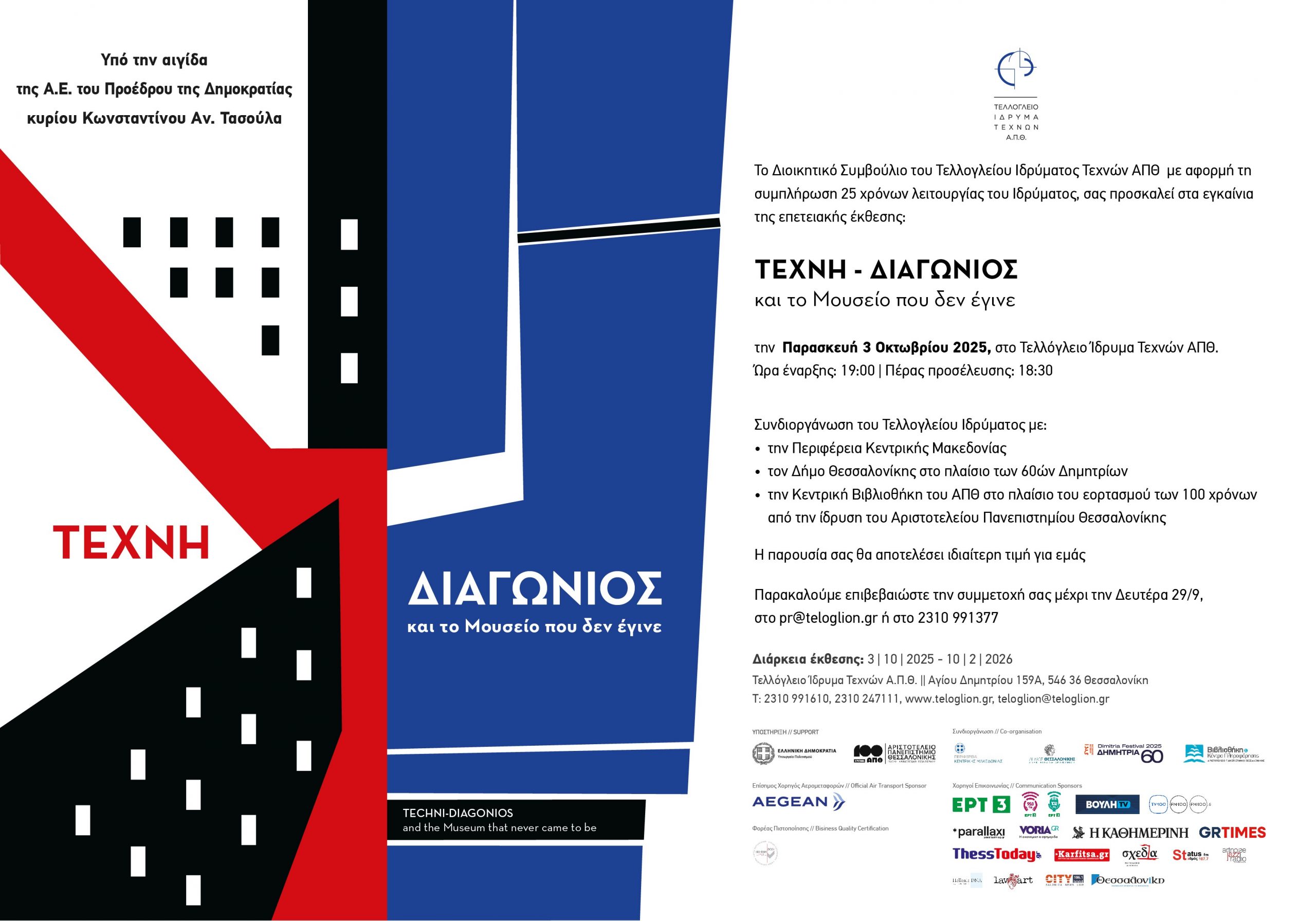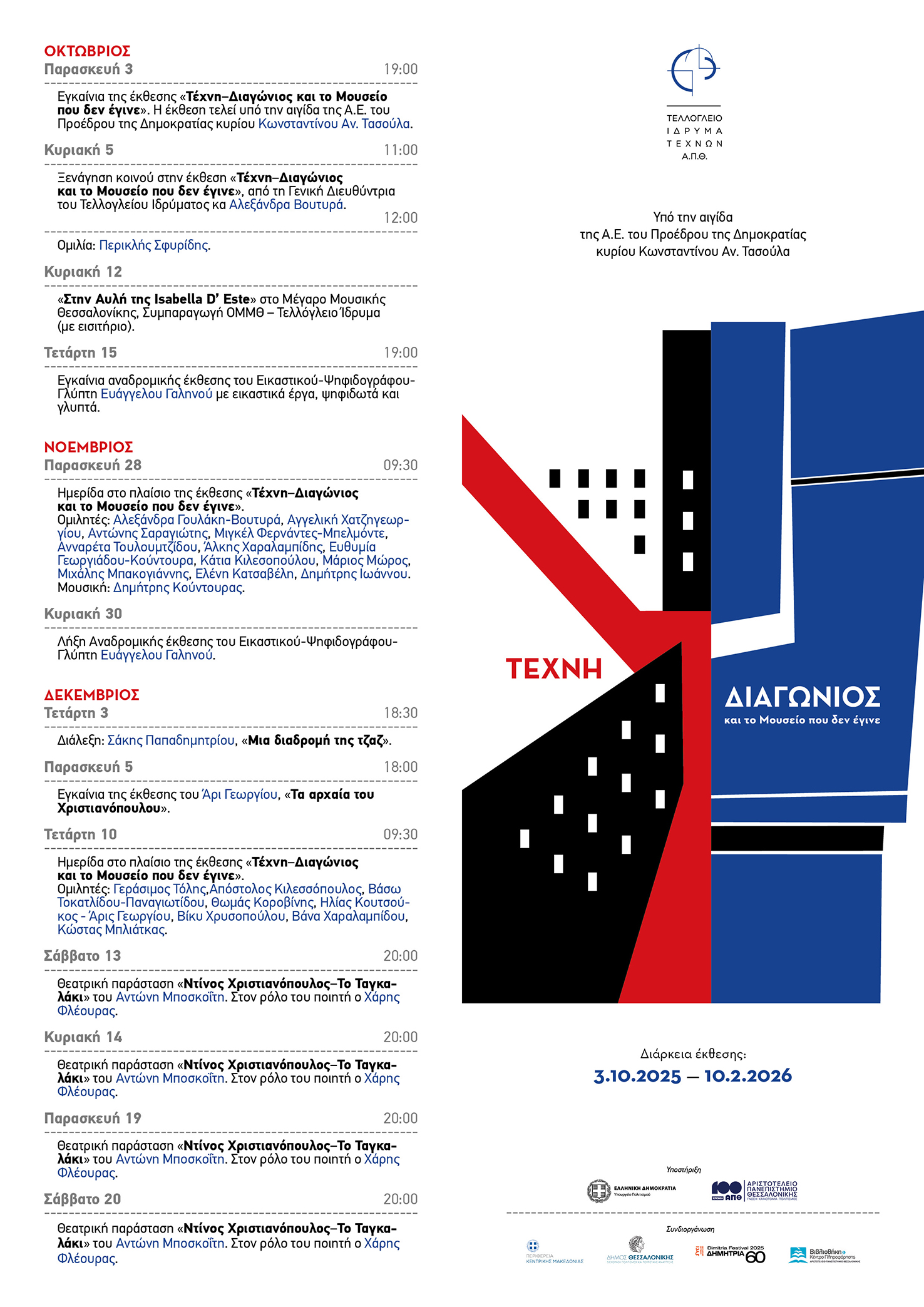 • 03/10: Έκθεση «Τέχνη» / Διαγώνιος, στο Τελλόγλειο Ίδρυμα Τεχνών, 400 έργων των συλλογών της Μακεδονικής Καλλιτεχνικής Εταιρείας και της δωρεάς του Ντίνου Χριστιανόπουλου της Κεντρικής Βιβλιοθήκης ΑΠΘ. Πρόσκληση και Πρόγραμμα Έκθεσης.